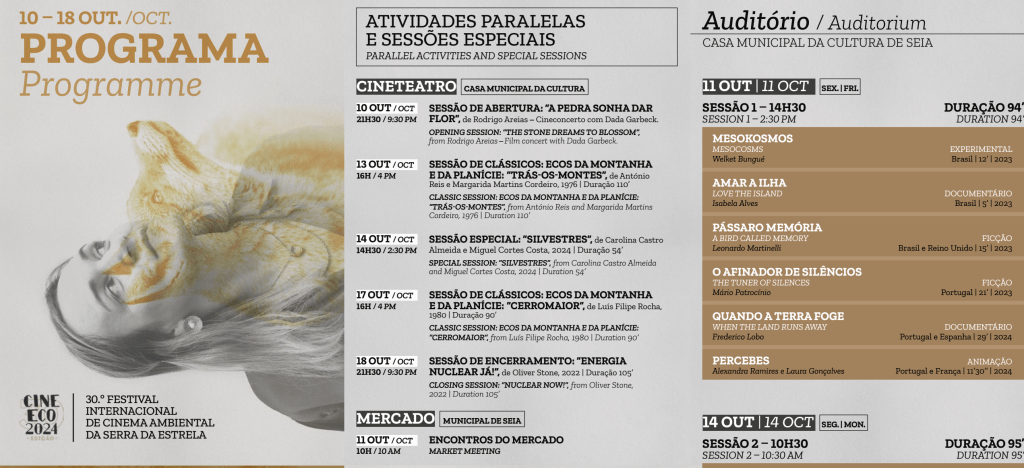 O festival inicia na noite de 10 de outubro com o CINECONCERTO A Pedra Sonha Dar Flor, um filme realizado por Rodrigo Areias, acompanhado por uma performance de música ao vivo por Dada Garbeck. Ao longo dos dias seguintes, serão exibidas mais de 60 obras cinematográficas oriundas de 27 países, complementadas por atividades dedicadas à sensibilização ambiental, incluindo workshops, sessões de networking, debates com realizadores e várias manifestações artísticas.